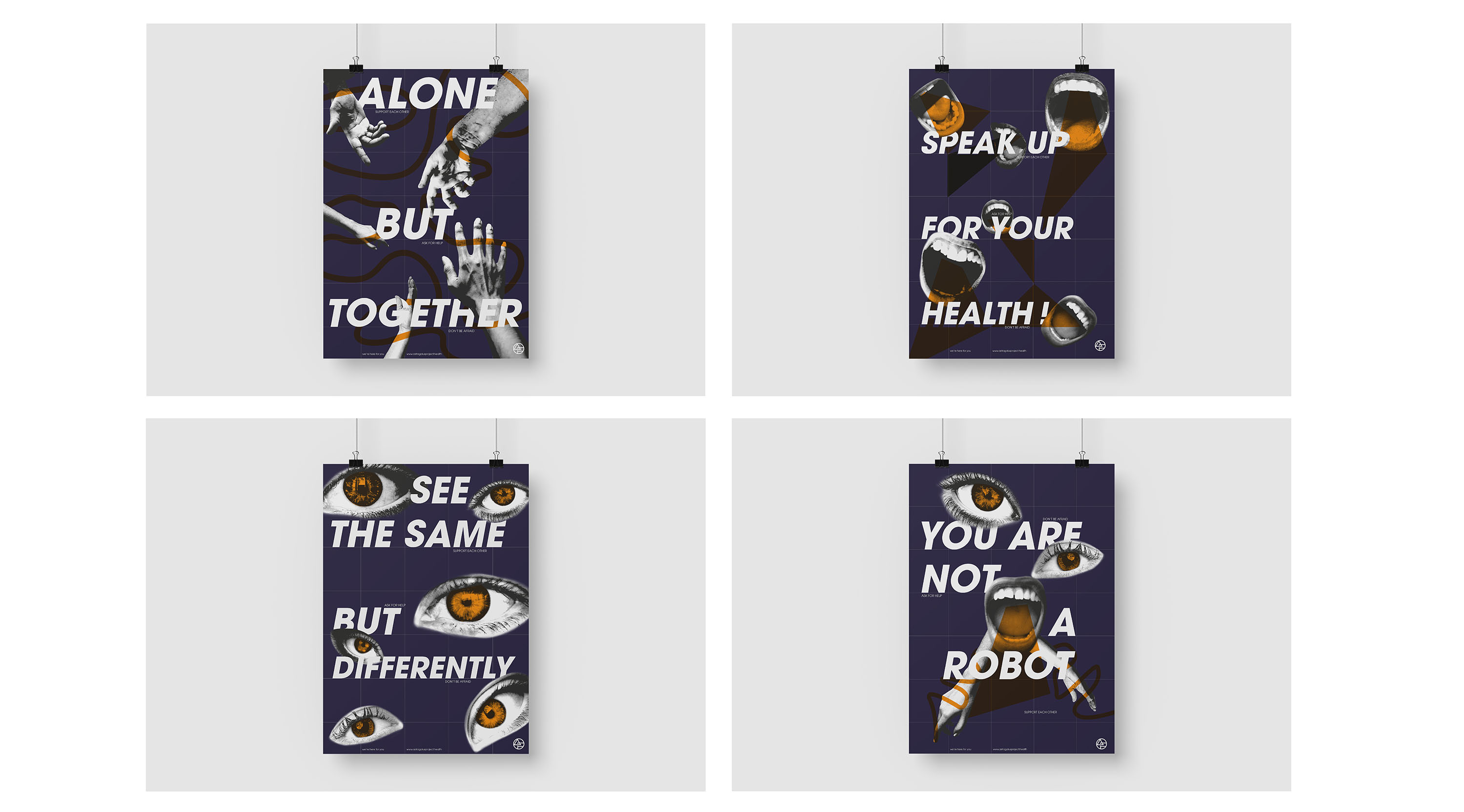 J'ai réalisé pour mon diplôme une identité visuelle d’une association humanitaire fictive, qui vient en aide de manière itinérante aux personnes en détresse psychologique. J’ai voulu refléter le concept de l’union et le fait que l'être humain n'est pas une machine. Les affiches sont réalisées en impression numérique, puis les éléments orange sont sérigraphiés par-dessus. L'avantage de la sérigraphie demeure dans l'encre orange qui ressort plus fortement qu'en numérique.