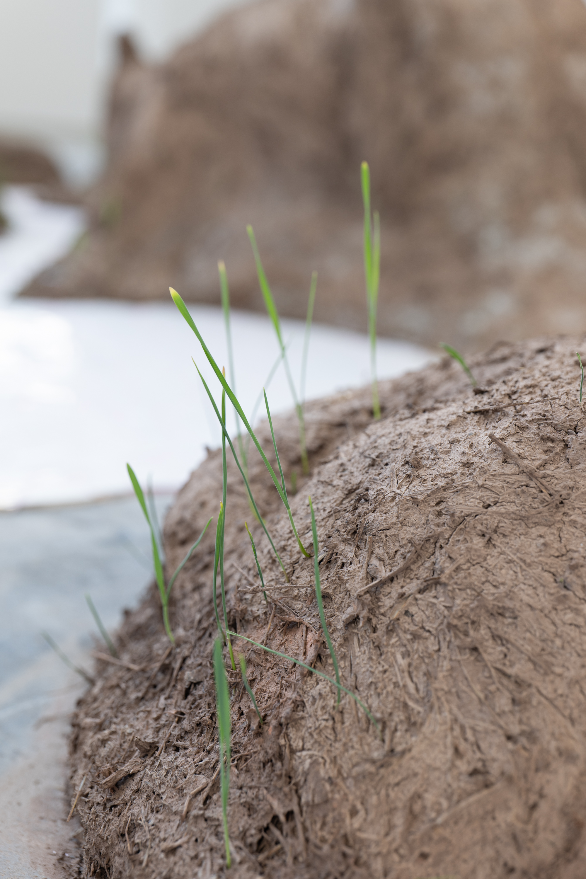 Cette proposition a démarré il y a un an, découvrant dans les bois un monument fort particulier, caché, commémorant une guerre, devenu lieu de culte pour l’extrême droite. La décision était alors de reproduire son socle et de lui trancher l’obélisque. Naquît alors un second monument. Nous avons célébré avec humour ce nouveau venu. Suite à cela, la structure s’est peu à peu désactivée. L'eau s’est écoulée sur le sol, les joints ont craqué. Plus tard, dans l’espace voisin, un homme tourmenté sonna une cloche durant huit heures. Aujourd’hui, ces expériences se rencontrent, proposant au spectateur d’observer le paysage hypothétique du cours d’eau, liquide devenant solide, un moment de cristallisation.