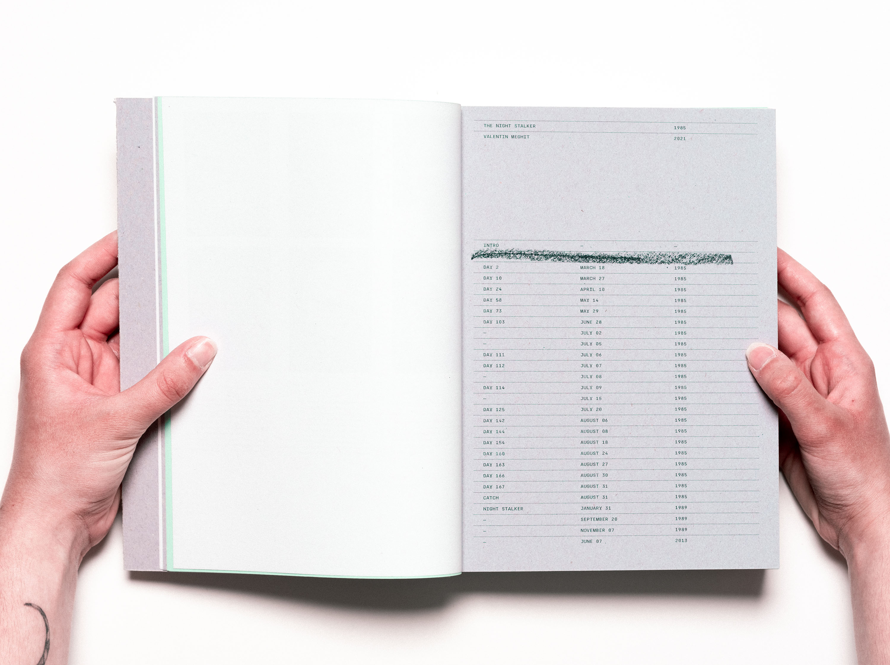 Ce projet de diplôme est une édition d’archivage qui retrace la cavale d’un tueur en série du nom de Richard Ramirez alias le traqueur de la nuit. Son activité meurtrière sévit durant l’été 1984 à Los Angeles. Sa foi envers le satanisme lui fera commettre de nombreux meurtres et viols d’enfants, de femmes et de personnes âgées. Du premier meurtre jusqu’au procès, l’ouvrage parcourt les enquêtes des deux détectives chargés du dossier. S’ajouteront aussi les témoignages des survivants et des proches des victimes ainsi que le rôle des médias dans l’enquête. Documentée avec des images exclusives teintées de vert et rouge, l’édition emprunte l’aspect visuel éditorial des années 80.