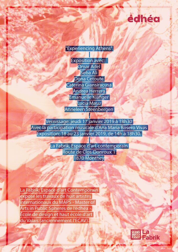 La Fabrik, Espace d’art Contemporain expose les travaux de huit artistes internationaux du MAPS - Master of Arts in Public Spheres de l’EDHEA. Le projet a été développé à Athènes et à Sierre dans le cadre du séminaire/workshop Media Sphere de Jérôme Leuba, avec l’assistance d'Aurélie Strumans et de Maximilien Urfer. Les huit projets ont été pensés et élaborés en rapport à la production de visibilité et à la médiatisation d’un espace réel, éloigné. Issu d’un processus de création, les travaux interrogent la relation entre une expérience, sa reproduction et sa médiatisation.